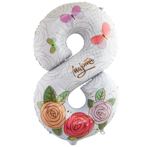 Фольгированный шар Шар (40"/102 см) Цифра 8, Розы, 8 марта, 1 шт. в уп.